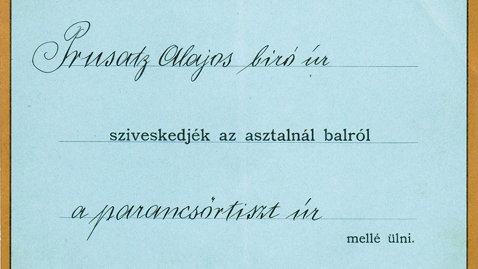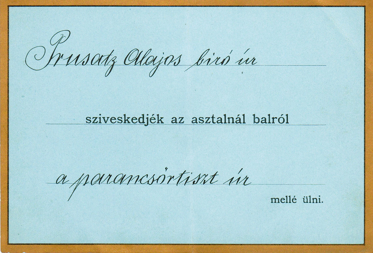 Uz pozivnicu za svečanu večeru sačuvane su i dvije kartice, svečanijeg izgleda, nebeski svijetloplave boje i obrubljene zlatom. Kartice su također ispunjene rukopisnim kratkim tekstom u crnoj tinti. Na jednoj stoji ime i funkcija Alojzija Prusca (Prusatz Alajos) i služi kao kartica za raspored sjedenja na postavljenom svečanom stolu, dok je na drugoj, također uz ime Alojzija Prusca, izražena dobrodošlica i navedeno je točno mjesto sjedenja za stolom: „stol nalijevo, pored gospodina zapovjednika“(prijevod s mađarskog jezika). Ova kartica s uputama davala se uzvaniku kod dolaska. Natpisi na karticama pisani su mađarskim jezikom. O pravilnom odabiru uzvanika velikim je dijelom ovisio uspjeh svečanog ručka ili večere.