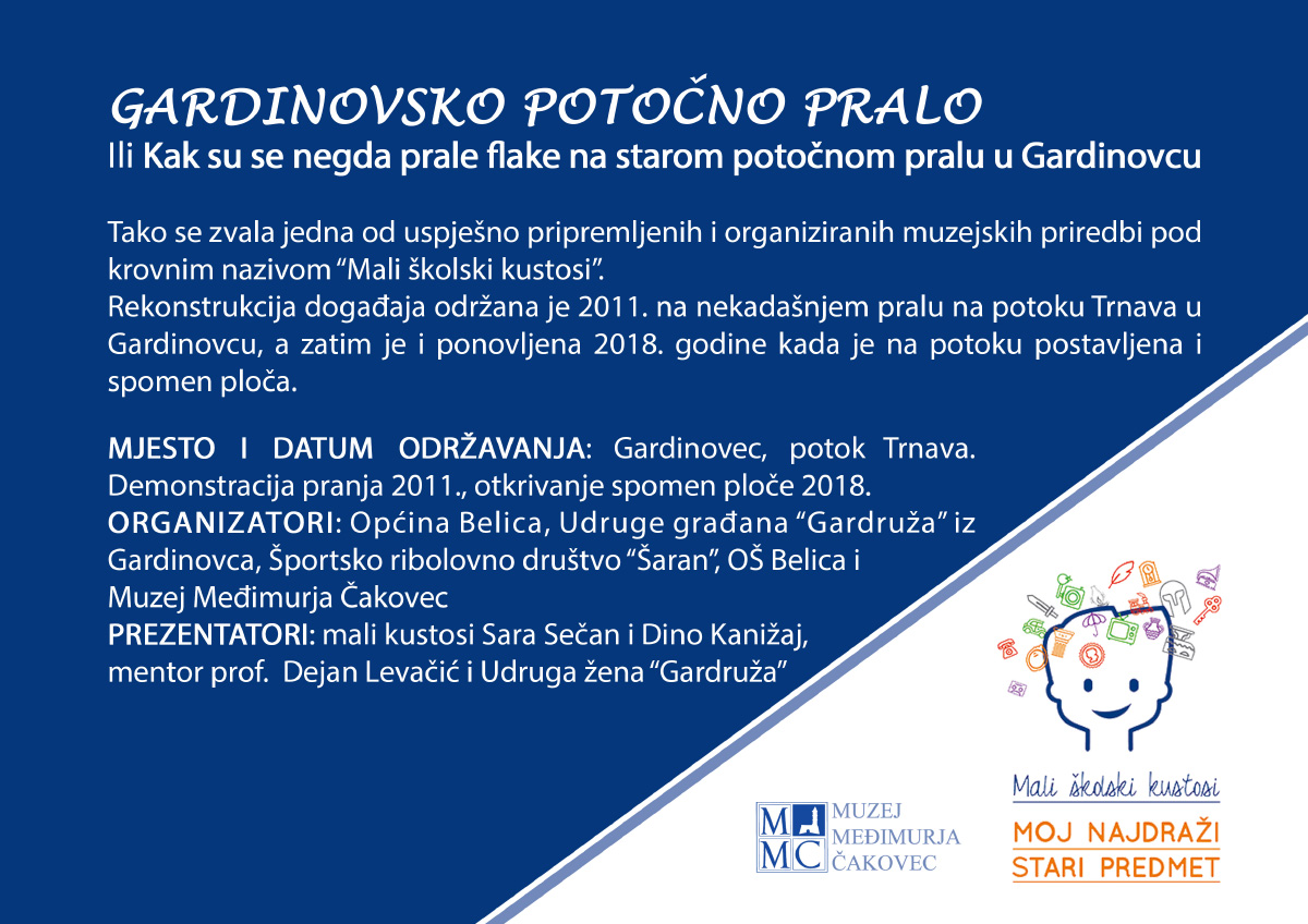 Muzej Međimurja Čakovec će ipak na neki način obilježiti Male školske kustose na Međunarodni dan muzeja - virtualnom izložbom s prikazom rekonstrukcije starog običaja pranja rublja na potoku Trnavi u selu Gardinovec. Taj događaj potekao je upravo od Malih školskih kustosa i istraživanja djece o Gardinevskom pralu koje je potaklo čitavu zajednicu da takav jedan događaj rekonstruira i obilježi spomen pločom.