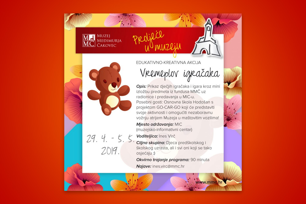 Stotinjak igračaka i društvenih igara koje se nalaze u fundusu MMČ-a predstavit će se malom tematskom izložbom koju će pratiti brojna događanja kroz čitav tjedan (ponedjeljak 29.04. do nedjelje 05.05.2019.) uz gostujuće predavače koji će, prije svega najmlađima, približiti raznolikost motiva i materijala od kojih su igračke rađene, prikazati načine izrade, upoznati ih s njihovom povijesti, ali i njihovom vrijednosti.
