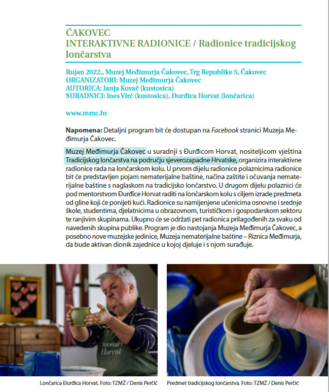 Muzej Međimurja Čakovec u suradnji s nositeljicom vještina Tradicijskog lončarstva na pdoručju sjeverozapadne Hrvatske Đurđicom Horvat organizira interaktivne radionice rada na lončarskom kolu.