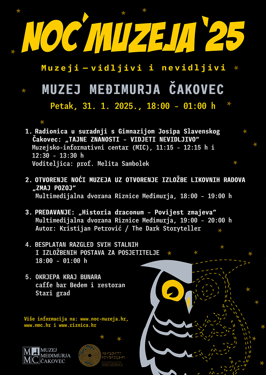 Jedna od najpoznatijih legendi na području Međimurja jest legenda o zmaju Pozoju, a ona nas povezuje s ovogodišnjom temom o vidljivom i nevidljivom. Pozoj u Međimurju ima brojna tajna skrovišta i pažljivo bira mjesto i vrijeme kada ćete ga vidjeti. Tko zna, možda je upravo ova Noć muzeja u Muzeju Međimurja Čakovec mjesto i vrijeme susreta...