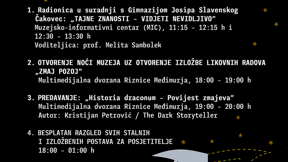 Osim besplatnog razgledavanja svih izložbenih muzejskih postava u vremenu od 18 do 01 sat, za naše najmlađe posjetitelje ovogodišnja će Noć muzeja početi već u prijepodnevnim satima dvjema edukativno-kreativnim radionicama. U večernjem dijelu programa manifestacija će započeti otvorenjem izložbe dječjih radova pristiglih na natječaj „Zmaj Pozoj“ i dodjelom nagrada autorima najboljih radova, a nastavit će se popularnim predavanjem Kristijana Petrovića, poznatoga i kao The Dark Storyteller’, pod naslovom: Historia draconum – Povijest zmajeva. Noć muzeja idealna je prilika i za besplatan razgled stalnih postava Riznice Međimurja, postava u palači Staroga grada te izložbe „Vunasti mamuti – divovi ledenoga doba“ u Izložbenom salonu MMČ-a i izložbe „Priča o dvama transportima. Židovi u Međimurju i Prekmurju za vrijeme holokausta“ u Multimedijalnoj dvorani Riznice Međimurja.