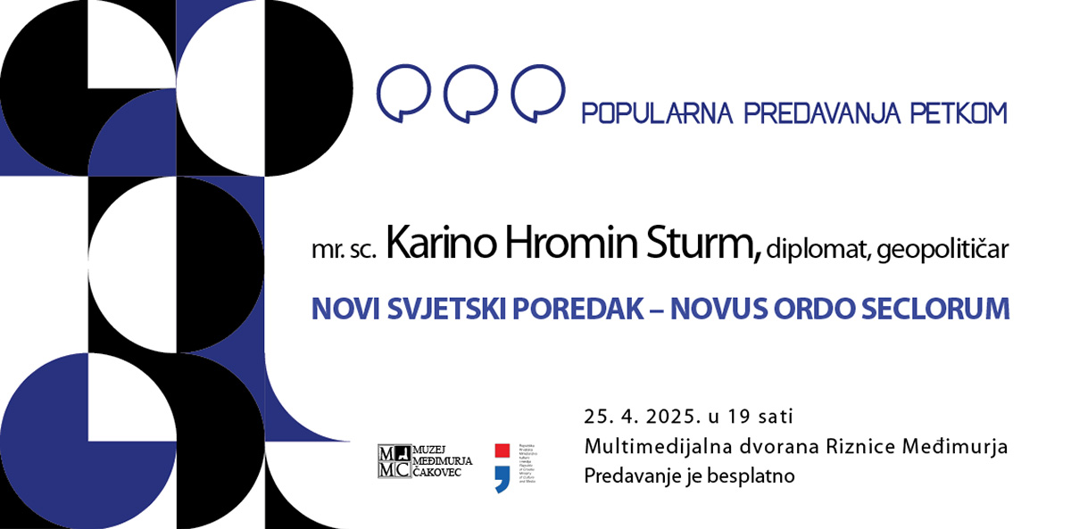 Na programu Popularno Predavanje Petkom Muzeja Međimurja Čakovec u petak, 25. travnja 2025. godine u 19 sati u Multimedijalnoj dvorani Riznice Međimurja predavanje na temu „Novi svjetski poredak – Novus ordo seklorum” održat će mr. sc. Karino Hromin Sturm. Među ostalim, odgovorit će na pitanja: Što je Novi svjetski poredak?, Tko njime upravlja?, Kako upravljaju svijetom?... Karino Hromin Sturm poznati je hrvatski ekonomist, publicist, diplomat i politolog. Bio je voditelj Ureda Republike Hrvatske u Moskvi početkom 1992. godine, gdje je radio na priznanju Hrvatske i uspostavi diplomatskih odnosa s Rusijom i drugim državama bivšeg SSSR-a. Godine 1995. otvorio je Veleposlanstvo RH u Kazahstanu i bio veleposlanik do 1998. godine. Također, poznat je kao autor „Političke Biblije 1” i „Strategije razvoja Republike Hrvatske” te kao predsjednik ekonomskoga pokreta „Zajedno”. Javno je istupao kao kritičar neoliberalizma i Europske unije.